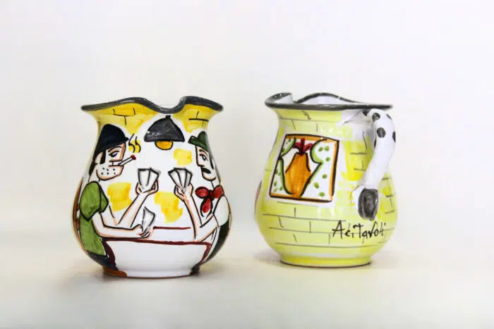 Parte della serie fumettistica, due uomini si sfidano a “Scopa” mentre dalla finestra si intravede la “sciara” di lava dell’Etna.