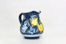 Brocca in ceramica con luminosi limoni gialli che risaltano su un intenso sfondo blu decorato, creando un contrasto elegante e mediterraneo, perfetto per una tavola di carattere.