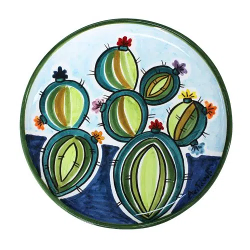 Parte della serie fumettistica, l’allegro decoro con fichi d’india stilizzati e piccoli fiori colorati, dalle linee vivaci e giocose. dona un tocco fresco e originale alle ceramiche. Perfetto per portare in tavola il sole del Mediterraneo.