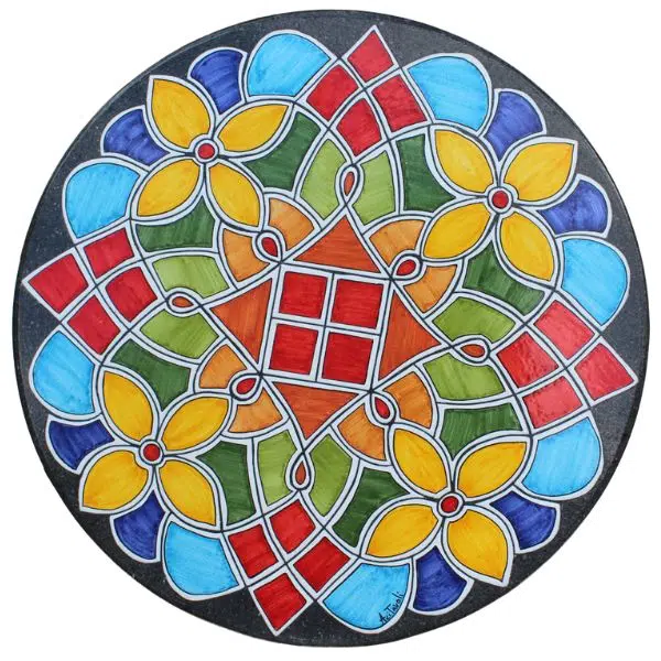 Un’esplosione di forme e colori prende vita su questo tavolo in pietra lavica ceramizzata, dove motivi geometrici si intrecciano con dei fiori in una danza armoniosa. Le tonalità vivaci dell’Arlecchino si riflettono come in un caleidoscopio, creando un’opera luminosa e dinamica che unisce arte, eleganza e fantasia mediterranea.