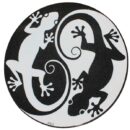 Il piano in pregiata pietra lavica dell’Etna, finemente ceramizzato e decorato a mano, dà vita a due gechi stilizzati disposti secondo la forma dello Yin e dello Yang — bianco su nero e nero su bianco. I gechi, creature agili e silenziose che punteggiano le notti siciliane e le pareti delle antiche dimore dell’arcipelago Isole Eolie, non sono solo simboli di presenza mediterranea, ma evocano la magia di un’isola sospesa tra tempo e leggenda.
