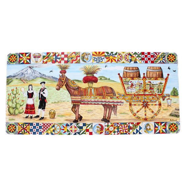 Un omaggio vivace alla tradizione siciliana, questo tavolo in pietra lavica ceramizzata raffigura il celebre carretto siciliano, simbolo di arte popolare e identità isolana.La scena, dipinta a mano da maestri ceramisti, mostra un cavallo bardato a festa, una coppia in abiti tradizionali e sullo sfondo l’imponente Etna, tra fichi d’India e campi dorati. La cornice, ricca di motivi geometrici e figure storiche, esalta i colori intensi e la vitalità tipica della cultura siciliana.