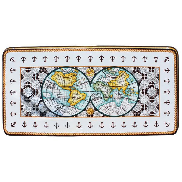Realizzato a mano in pietra lavica ceramizzata, questo tavolo raffigura una mappa del mondo in stile antico. La superficie presenta due emisferi con i principali oceani indicati in lingua italiana — Oceano Pacifico, Atlantico e Indiano — incorniciati da un elegante motivo geometrico ispirato alle maioliche mediterranee. Il bordo esterno, decorato con ancore stilizzate e un profilo a corda dorata, richiama il fascino marinaro e l’eleganza classica.
