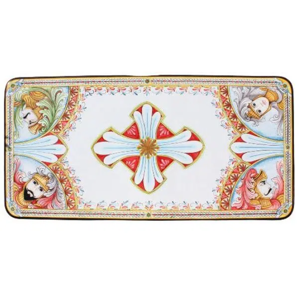 Un’eccellenza dell’artigianato siciliano, questo tavolo in pietra lavica ceramizzata raffigura la Corte di Carlo Magno in tutta la sua regalità. Al centro, una croce decorativa dai toni rossi e azzurri si irradia in armonia verso i quattro volti nobiliari posti agli angoli, simboli di potere, eleganza e storia.