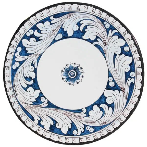 Eleganza e armonia si fondono in questo tavolo in pietra lavica ceramizzata dall’intenso blu. Gli eleganti motivi barocheggianti bianchi, incorniciano un fiore stilizzato al centro, simbolo di equilibrio e raffinatezza mediterranea. Un’opera che unisce arte, luce e materia in un’unica creazione senza tempo.