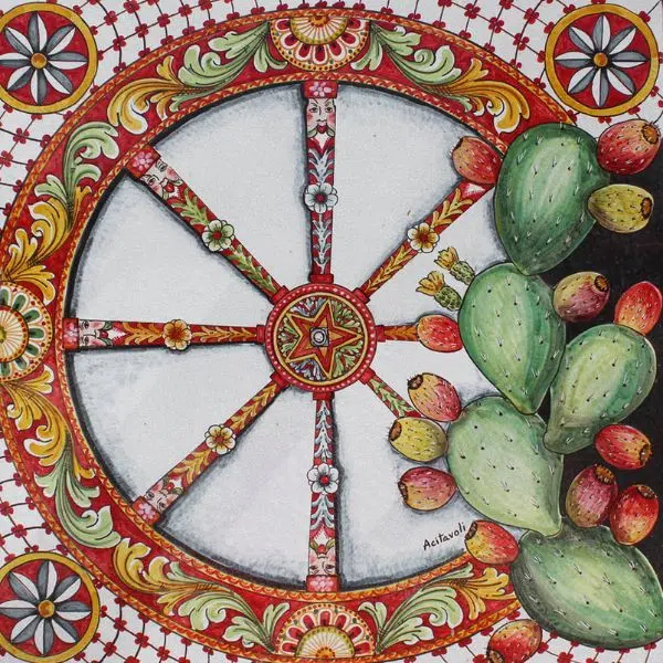 Un omaggio ai colori e alle tradizioni della Sicilia. Il piano, in pietra lavica dell’Etna ceramizzata e decorata a mano, raffigura la ruota del carretto siciliano, arricchita da vivaci motivi floreali e fichi d’India dai toni caldi e solari. Un capolavoro di artigianato che racchiude storia, simbolismo e autentica bellezza mediterranea.