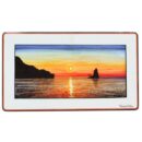Piano in pietra lavica dell’Etna, ceramizzato e decorato a mano propone in una simil-cartolina gli splendidi faraglioni eoliani, visti dalle spiagge nere dell’sola di Vulcano.